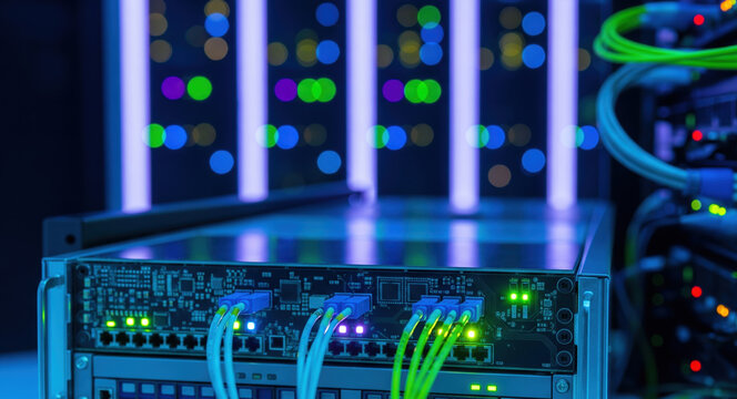 Network server equipment with colorful led status lights, fiber optic cables. Data center infrastructure, cloud computing hardware, enterprise networking technology facility.