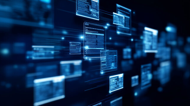 Abstract digital data panels floating in a dark space, symbolizing information flow, data systems, and advanced technology infrastructure.