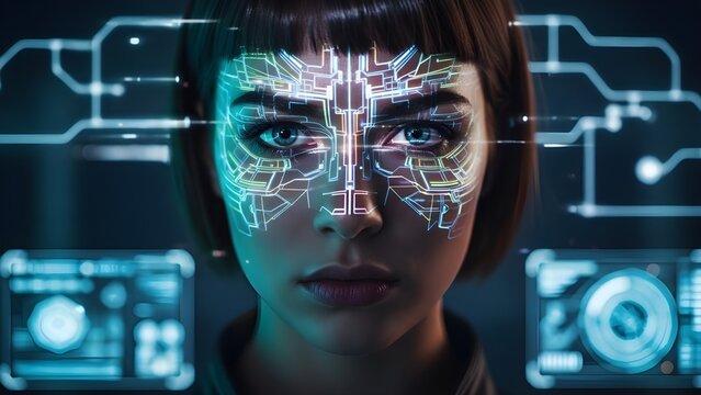 Futuristic digital portrait of a woman with a glowing circuit interface, symbolizing human-AI integration, advanced technology, and the evolution of digital consciousness