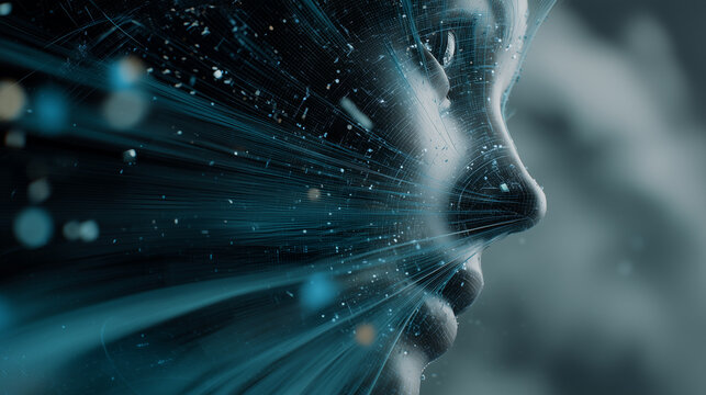 A person's head with a digital interface representing advanced technology and cognitive processing in the modern world