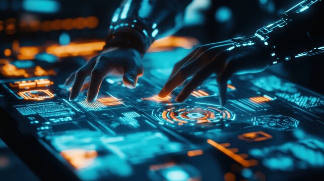 Robotic hand interacting with holographic interface in futuristic lab