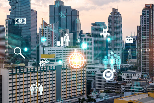 Glowing hologram of technological process, aerial panoramic cityscape of Bangkok at sunset. The largest innovative hub of tech services in Asia. Multi exposure.