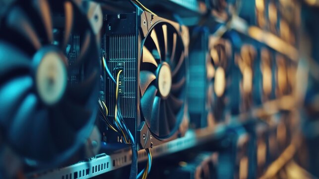 Close-up of server racks displaying intricate computer hardware, glowing softly in ambient light, conveying a sense of advanced technology and connectivity.
