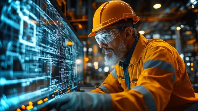 Worker analyzing construction site with digital data overlay