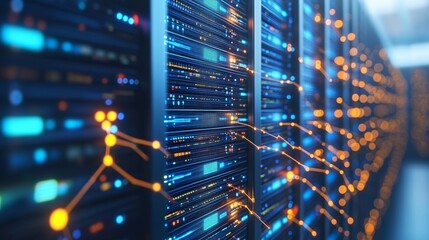 Futuristic server room with glowing connection lines and vibrant data streams in a cinematic style capturing advanced technology