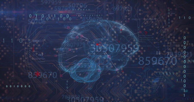 Image of data processing with digital brain over computer circuit board on black background