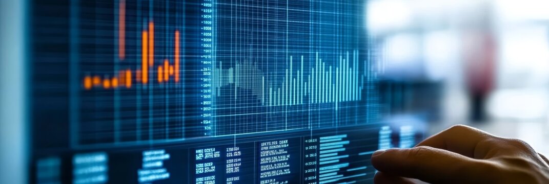 Digital finance dashboard with market trend analytics in office