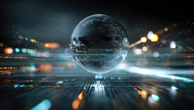 Abstract Digital Globe: An ethereal digital orb, illuminated with intricate data patterns, levitates over a reflective surface, offering a mesmerizing glimpse into a complex.