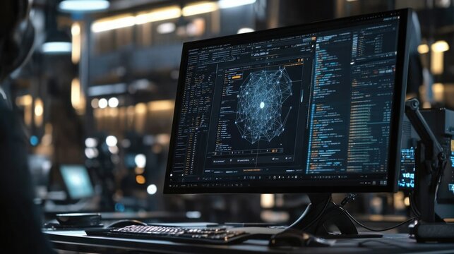 A modern computer screen displaying advanced data analytics with blue digital graphics and code lines, representing innovation and technology in a contemporary workspace.