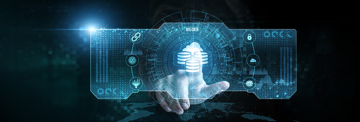Businessman touching the big data icon on the digital screen analysing data. data lakes, advanced analytics, machine learning algorithms, cloud computing, real-time processing.