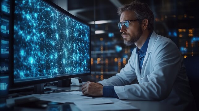 Focused analyst monitors data visualizations on a digital interface in a dark office environment