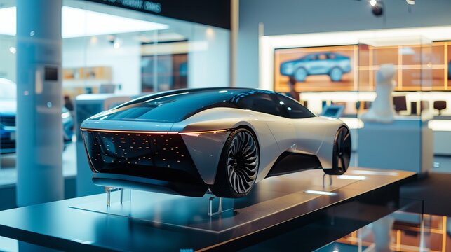 A sleek, futuristic car design showcased in a modern exhibition space, highlighting advanced automotive technology and innovation.