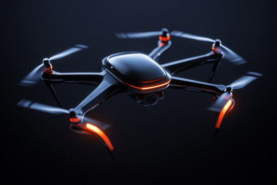 A sophisticated drone is captured mid-air, showcasing its innovative design and glowing details. The black background adds depth, highlighting its futuristic technology and advanced features