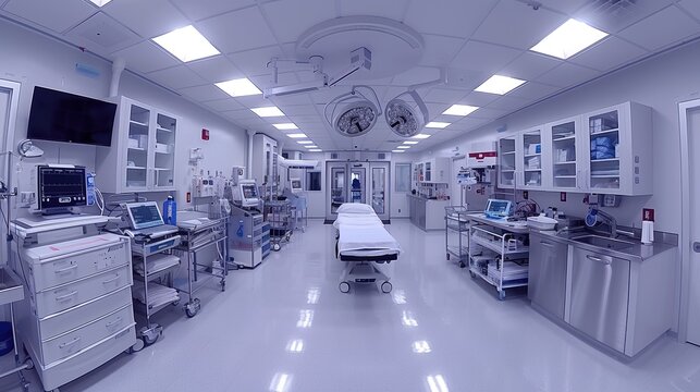 A highly equipped, state-of-the-art hospital operating room with advanced medical devices, monitoring systems, and surgical tools, ready for complex surgeries and patient care treatments