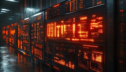 High tech data center illuminated by futuristic digital code overlay