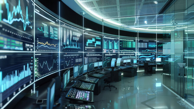A high-tech control room with multiple screens displaying various data and analytics, depicting a futuristic and cutting-edge environment.