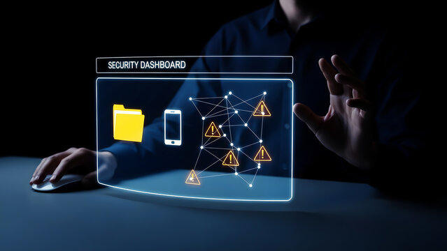 Futuristic technology interface with virtual data visualization and cyber security elements