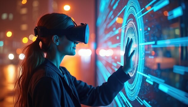 Woman wearing VR headset interacts with futuristic digital interface. Neon lights, cybernetic elements create immersive experience. Exploration of virtual world with advanced technology simulation.