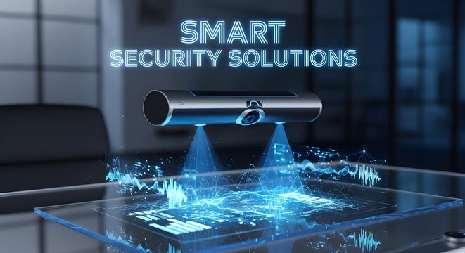 A futuristic smart security camera hovers above a glowing holographic interface displaying data, symbolizing advanced security solutions and technology