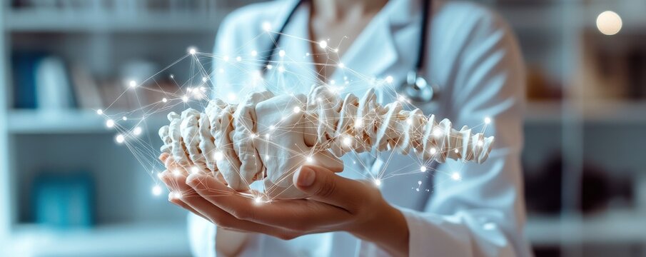 Doctor holding an anatomical spine model with digital network overlay indicating medical innovation