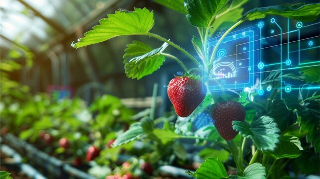 a close-up shot of a strawberry plant with a digital overlay