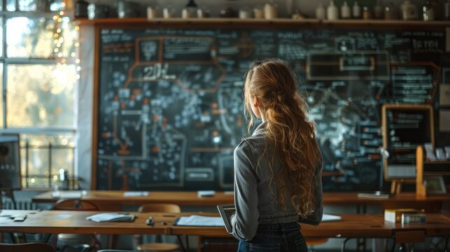 Woman solving advanced mathematical equations on chalkboard in classroom