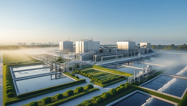 A modern urban wastewater treatment facility featuring advanced filtration systems and eco-friendly technology, designed for efficient water purification in a sustainable city environment.
