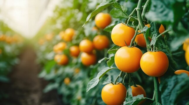 Ripe juicy tomatoes growing on the vine in a lush agricultural setting with a deep depth of field  Showcasing advanced food technology and precision farming techniques for monitoring crop ripeness and