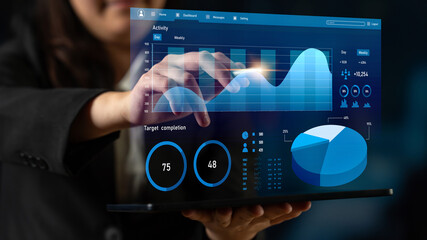 A business professional engages with advanced technology, analyzing critical data and visualizing essential metrics to improve decision-making processes in modern enterprises. Scalp