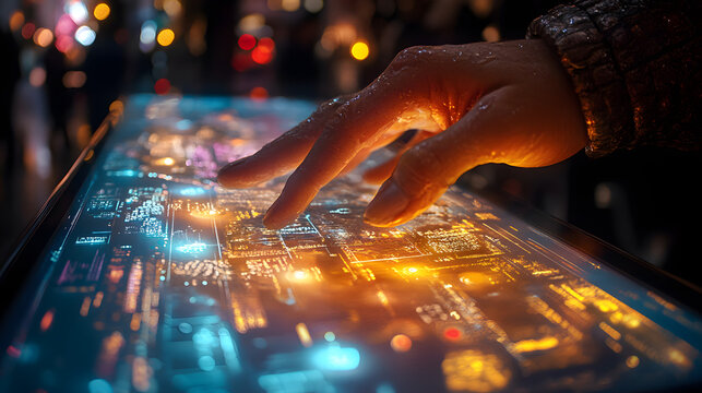 A high-tech hand exploring an interactive glowing map interface, showcasing advanced technology and connectivity in a vibrant futuristic city backdrop.. AI Generation