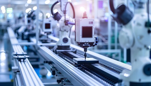 A modern manufacturing facility showcasing advanced machinery and automated tools in a vibrant industrial setting.