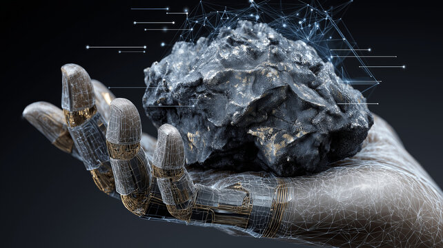 Robotic hand holds piece of raw mineral ore, symbolizing intersection of technology and natural resources. digital network overlay suggests data analysis in mining