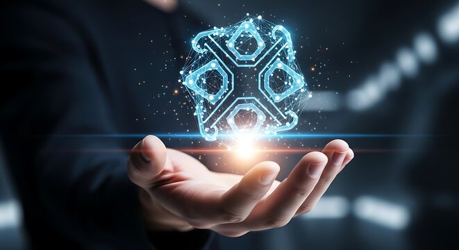 A hand presents a radiant, abstract digital corporate symbol, composed of interconnected blue lines and dots, signifying collaboration and advanced networking solutions.
