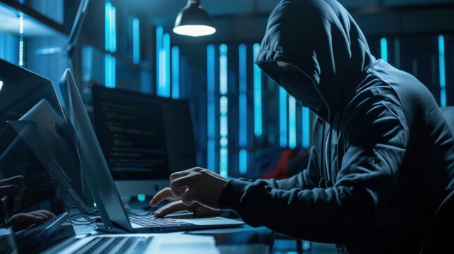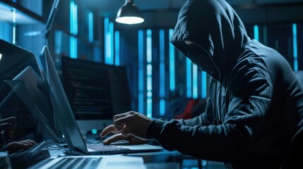 Dangerous hooded hacker breaks into company servers dark atmosphere multiple displays, hacking concept.