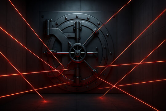 Bank vault secure door with red laser beams, high security protection system, financial treasure safety concept, futuristic robbery prevention technology, strong metal safe with advanced security lock