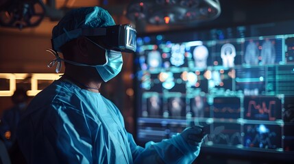 Surgeons in a high-tech operating room using advanced AI and virtual reality interfaces for a precision-led surgery, with digital data overlays and monitoring screens.