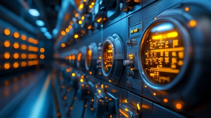 Futuristic control panels glowing with orange lights in a modern server room. Generative AI