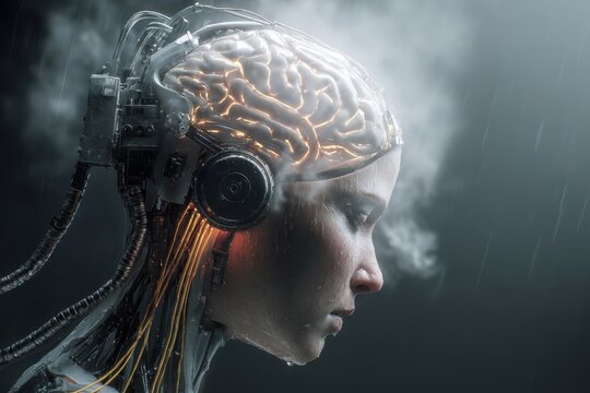 Brain connected to technology showcases the merging of human cognition and advanced machinery in a modern, innovative environment during a futuristic setting