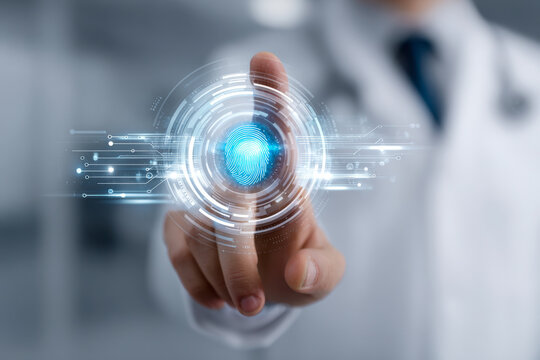 Doctor using digital fingerprint scanning technology for secure access and identity verification in a futuristic medical environment with advanced interface design