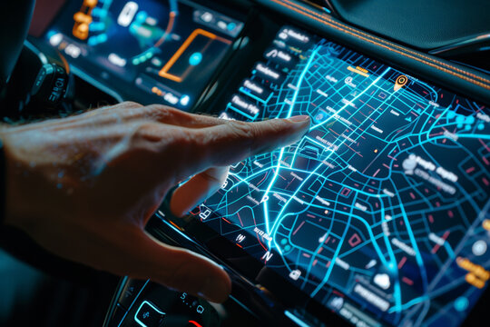 Close-up of a Hand Interacting with Advanced Car Navigation Touchscreen System