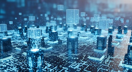 Abstract visualization of a futuristic quantum computer chip with glowing blue circuits and processors