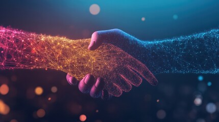 An image of a handshake combined with technology network elements, illustrating data exchanges and customer connections within a social network concept.