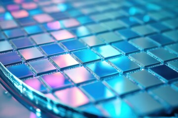 Large silicon wafer with microchips in perfect grid, reflecting lab lighting
