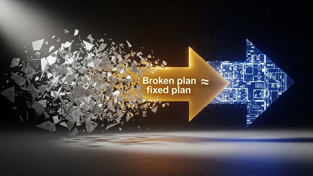 Broken plan | fixed plan Arrow transforming from shattered documents to blueprint plan