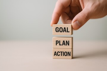 Hand stacking wooden blocks labeled goal plan action on a flat surface with a plain background.