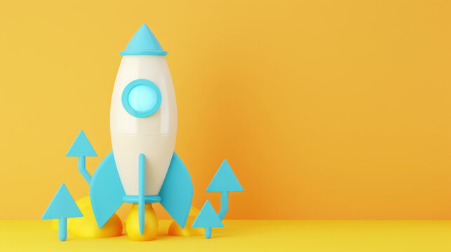 3D render of a rocket with blue arrows pointing up, against a yellow background
