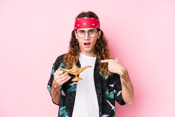 Long hair caucasian man holding a magic lamp isolated surprised pointing at himself, smiling broadly.