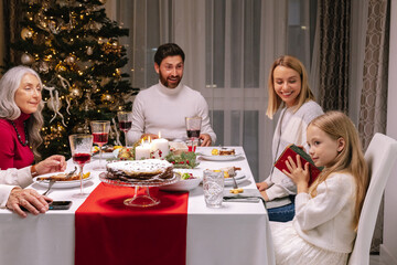 Photo of full family four members x-mas gathering hold mug drink eggnog share news have fun wear outerwear hat scarf coat gloves multi-generation night street park illumination fair outdoors