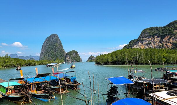 Longtail boats at Hin Rom Pier at Phang Nga Bay, Khlong Khian, Thailand, Southeast Asia.