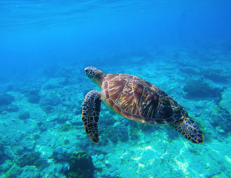 Green turtle swimming in tropical seawater. Sea turtle in wild nature.